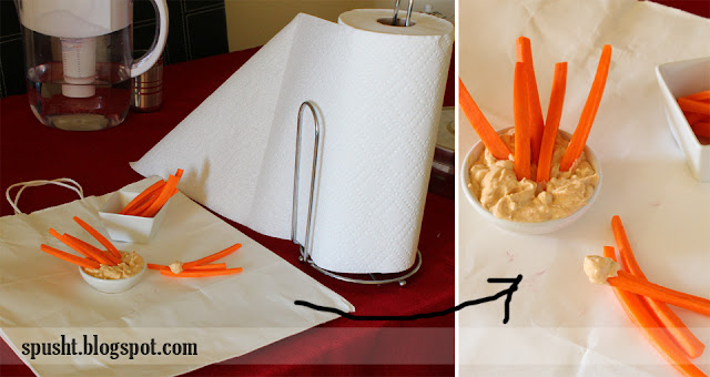 What I did: This was a really simple and quick shot with carrots and dip. I didn't have time or planned to make it creative so dipped the carrots in the dip and kept some on the side. Surface is a white paper bag (!!) for a plain background so carrots are clear, and used paper towel roll (!!) as reflector instead of my usual thermocol. You can get an idea of the angle the photo was clicked.